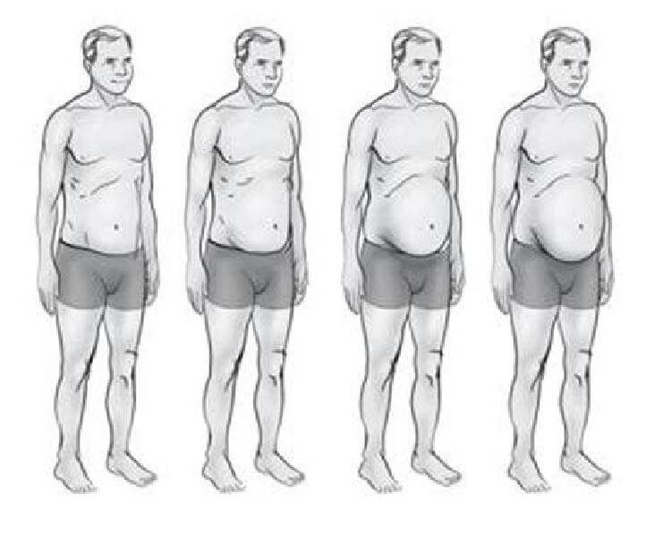 Vyrams išsivysto gonadinis kūno tipas, kai didžioji dalis jų svorio tenka klubams ir sėdmenims, o pečiai atrodo siauresni nei klubai. Antsvoris pasireiškia alaus pilvu.