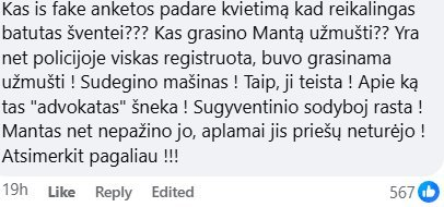 „Kas iš fake (aut. past. – netikros) anketos padarė kvietimą, kad reikalingas batutas šventei??? Kas grasino Mantą užmušti?? Yra net policijoje viskas registruota, buvo grasinama užmušti! Sudegino mašinas! Taip, ji teista!