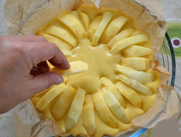 Obuolių griežinėlius į tešlą sudėkite bet kokia tvarka.