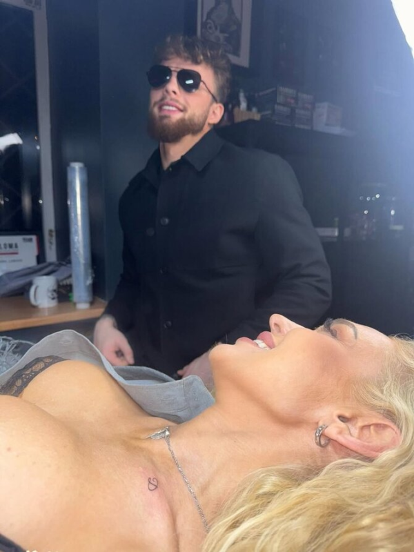 Nuotraukose matyti, kaip atlikėjai daroma tatuiruotė. Šalia jos tuo metu stovi ir visą procesą stebi mylimasis Dominykas Dirksčys.