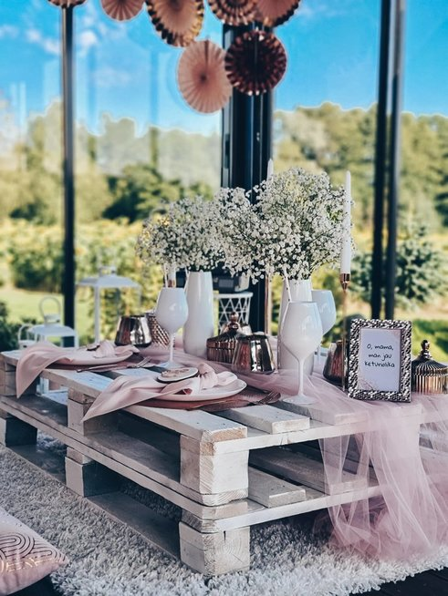 Ir tai pirmasis toks gimtadienis, kai dalyvavo kartu šeimos nariai ir mergaitės draugai. Tad norėjosi, kad ji būtų ir jaunatviška, ir subtili. Žaismingumą suteikė žibintai, dovanėls svečiams, o gėlės pridavė elegancijos ir net, sakyčiau, kuklios prabangos.