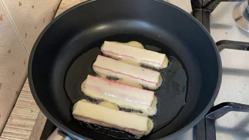 Mes nuleidžiame lazdeles į clerusus, įdedame į keptuvę su šildomu augaliniu aliejumi, kepame iš visų pusių.