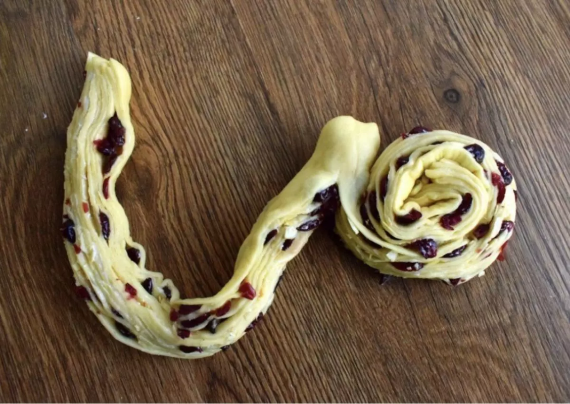 Tešlą susukite į ritinį ir atsargiai perpjaukite išilgai, nepasiekdami vieno krašto.