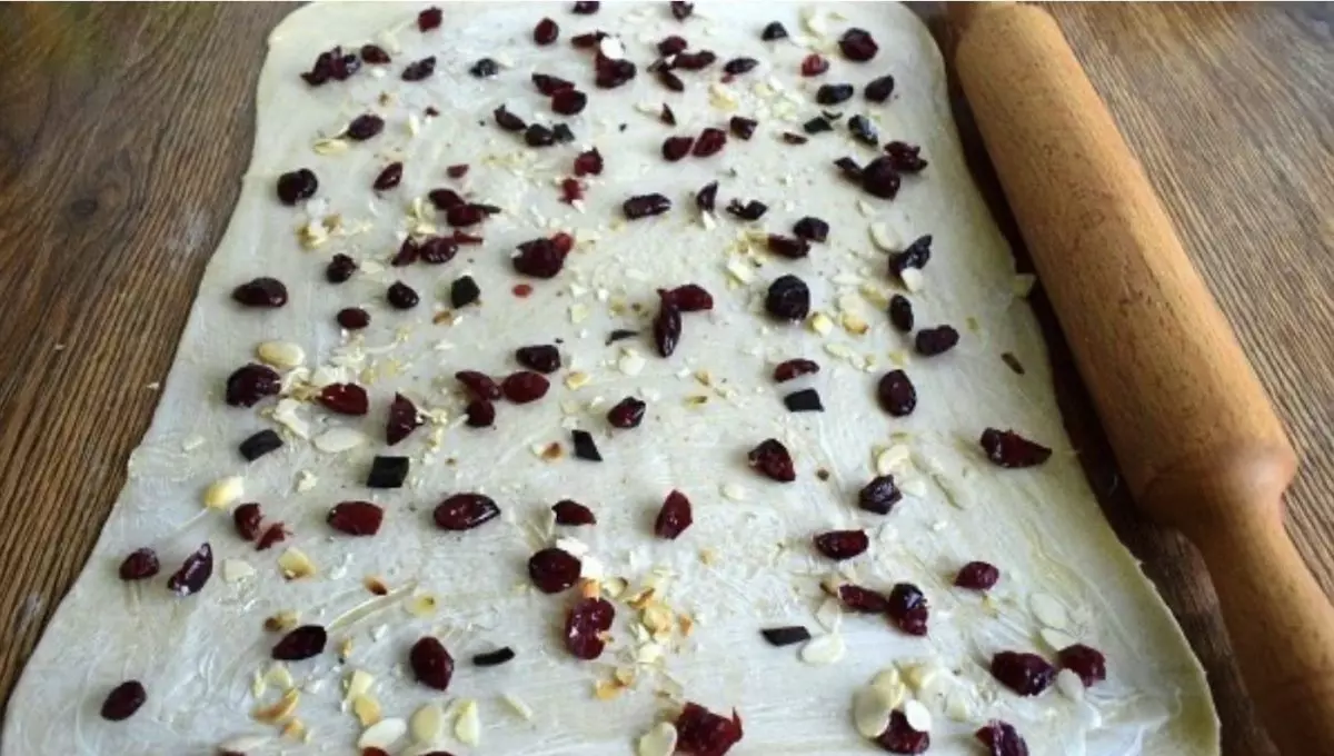Kiekvieną gabalėlį iškočiokite į ploną stačiakampį. Viršų patepkite sviestu ir tolygiai paskleiskite spanguolių, muskato riešutų ir graikinių riešutų įdarą.