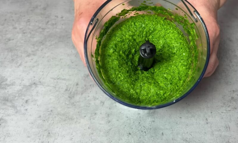 Susmulkinkite laiškinius svogūnus, šviežią česnaką ir petražoles. Jei norite, įdėkite krapų ir salierų, kurie suteiks dar sodresnį skonį žaliajam padažui. Sutrinkite susmulkintas žoleles trintuvu.