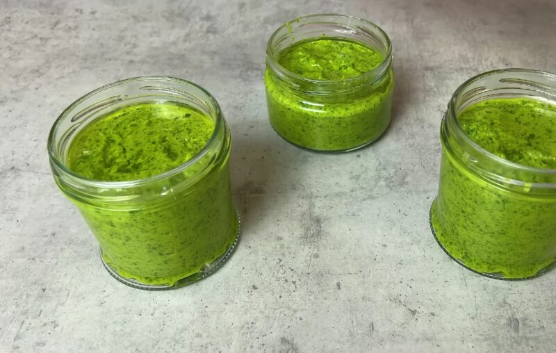 Paruoštą žalią padažą supilkite į stiklainius. Norėdami pailginti padažo galiojimo laiką, apšlakstykite jį nedideliu kiekiu augalinio aliejaus.